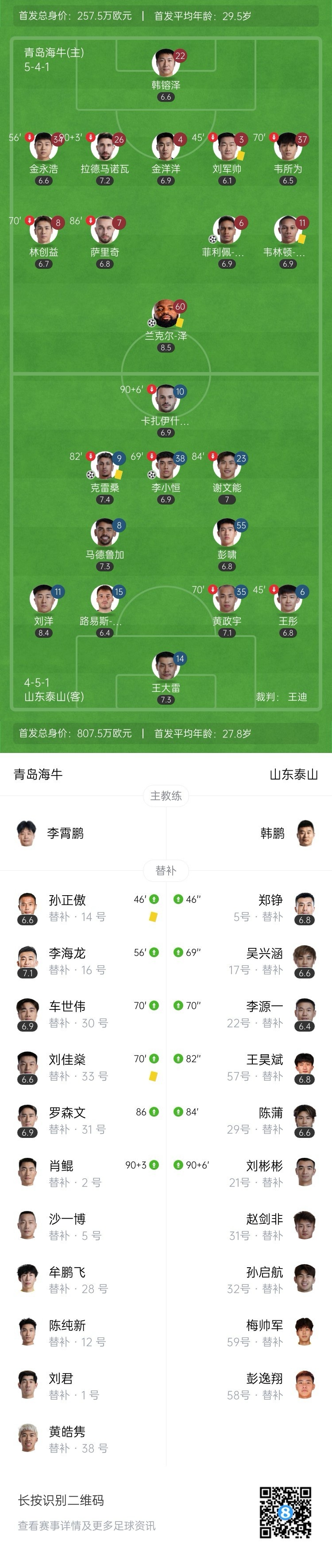 全场比赛结束,山东泰山客场2-2战平青岛海牛。