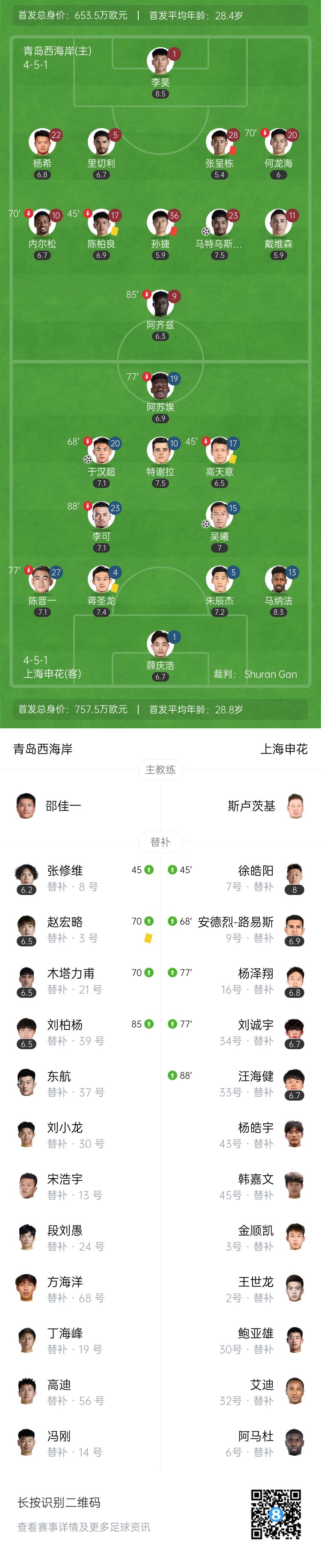 第20分钟,吴曦主罚点球破门,上海申花1-1扳平青岛西海岸↓