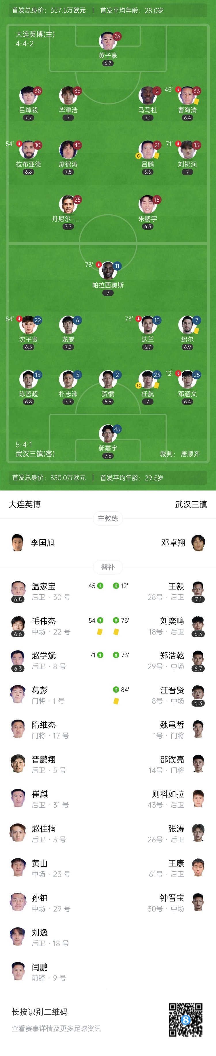 10月19日讯 中超第27轮,大连英博坐镇主场中升梭鱼湾足球场迎战武汉三镇。上半场,刘祝润、朱鹏宇造险,邓涵文伤退。易边再战,马马杜造险+中楣,龙威门线解围,郭嘉宇神扑救主。最终大连英博0-0武汉三镇。积分榜方面,大连英博四轮不胜34分仍第十,武汉三镇25分第十二。