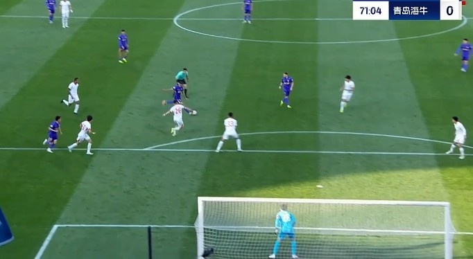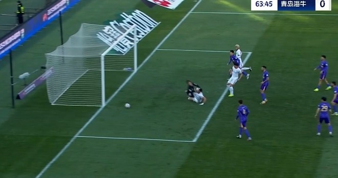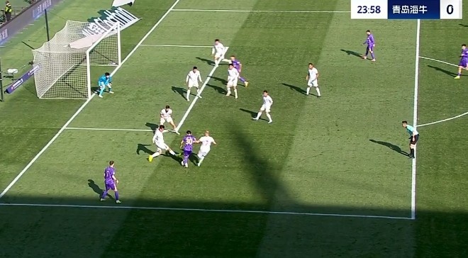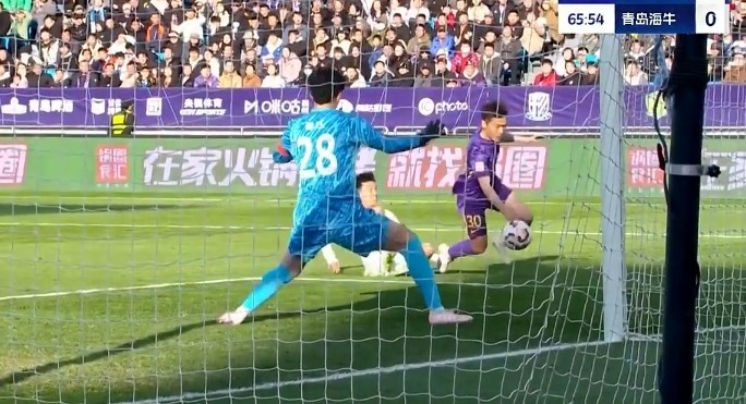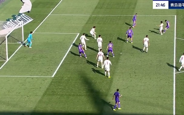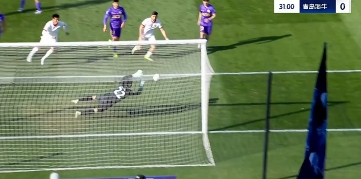 第31分钟,青岛海牛禁区里一次头球攻门被门将飞身扑出底线。↓