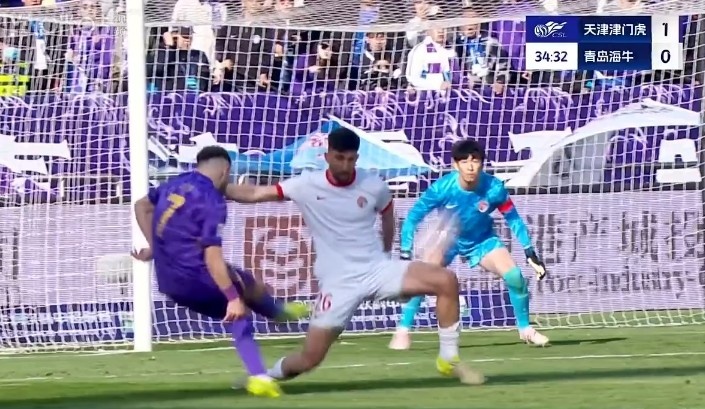 第16分钟,基莱斯禁区里停球回做,罗斯推射左下角得手,天津津门虎1-0青岛海牛。↓