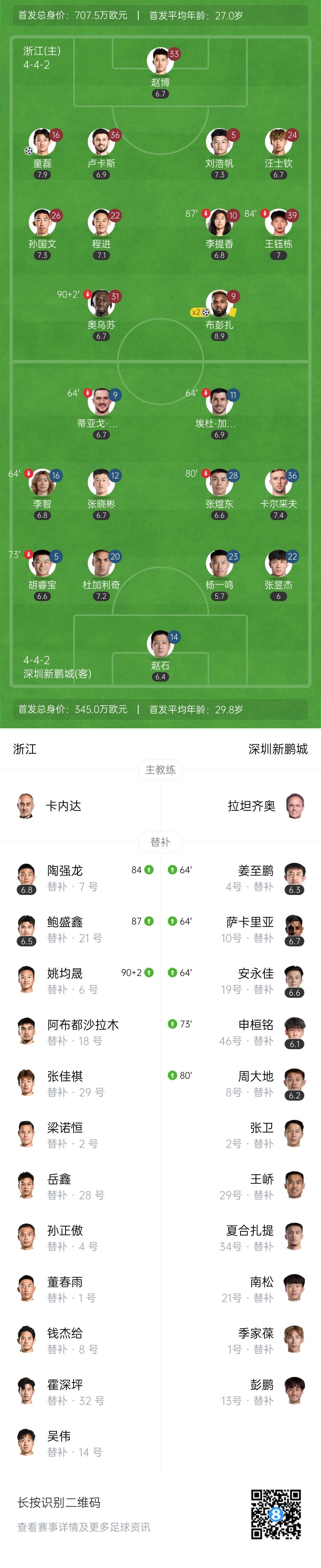 4月1日讯 北京时间19:35,中超第4轮浙江vs深圳新鹏城,比赛在杭州黄龙体育中心打响!上半场,布彭扎头球破门,近2场攻入3球。下半场,赵博扑出埃杜-加西亚单刀。补时阶段,布彭扎投桃报李,助攻童磊破门;读秒阶段布彭扎再下一城!最终,浙江队3-0战胜深圳新鹏城,取得中超2连胜!开赛2胜2平保持不败!先赛暂时登顶中超积分榜。