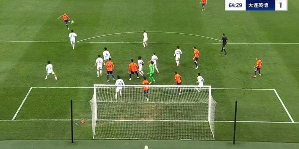 第32分钟,大连英博客场取得领先,拉布亚德左路角球开至后点被解围出禁区,吕焯毅停球之后起脚远射,皮球飞入远角,英博1-0领先青岛海牛。↓