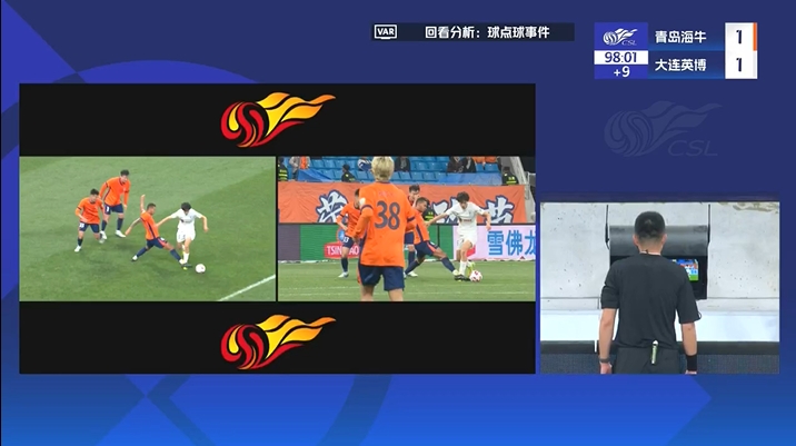 第98分钟,朱鹏宇禁区内带球被踩倒,主裁判第一时间没有吹罚,随后查看VAR后,主裁判吹罚点球。第99分钟,马莱莱主罚点球被牟鹏飞扑出。↓