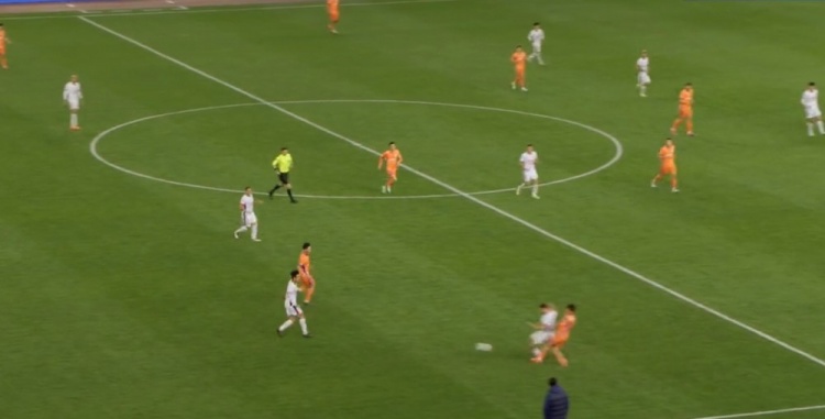 第80分钟,刘洋杀入禁区后和李扬发生对抗倒地,主裁判第一时间判罚点球,但经VAR回放后将点球取消。↓