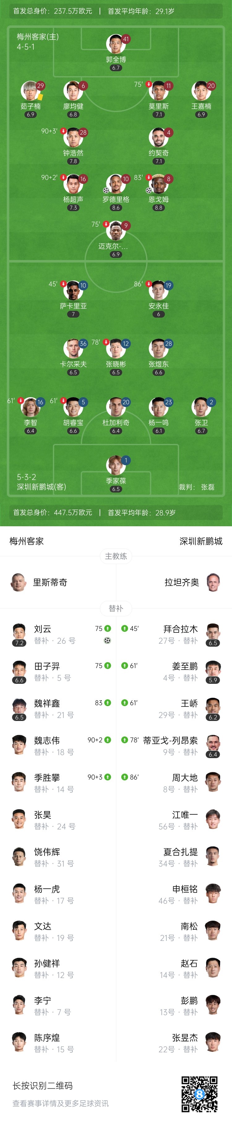 罗德里戈主罚点球命中,梅州客家1-0深圳新鹏城。↓