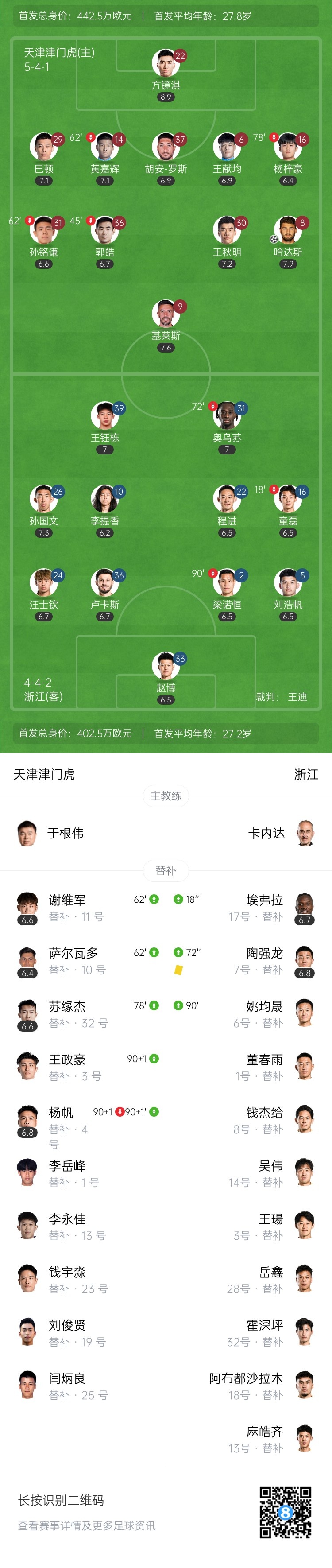 下半场补时6分钟。最终全场比赛结束,津门虎2-0浙江。