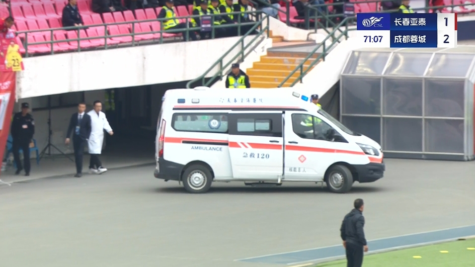 玄智健伤退!第67分钟,19岁玄智健争顶时落地受伤,随后被救护车送出场外!↓