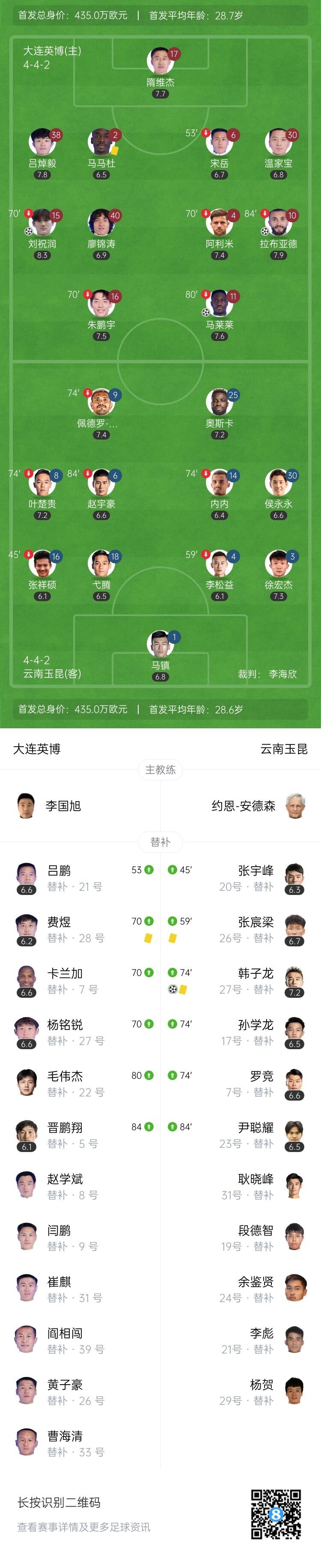 中超-大连英博3-2云南玉昆,刘祝润一条龙玉昆连扳两球仍5轮不胜