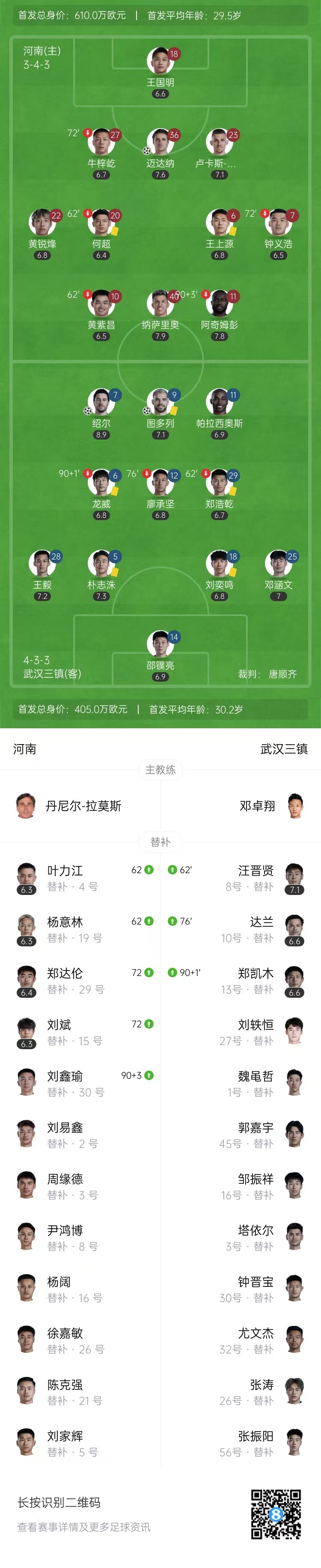 第53分钟,纳萨里奥角球开出,迈达纳头球攻门打破僵局,河南1-0武汉三镇。↓