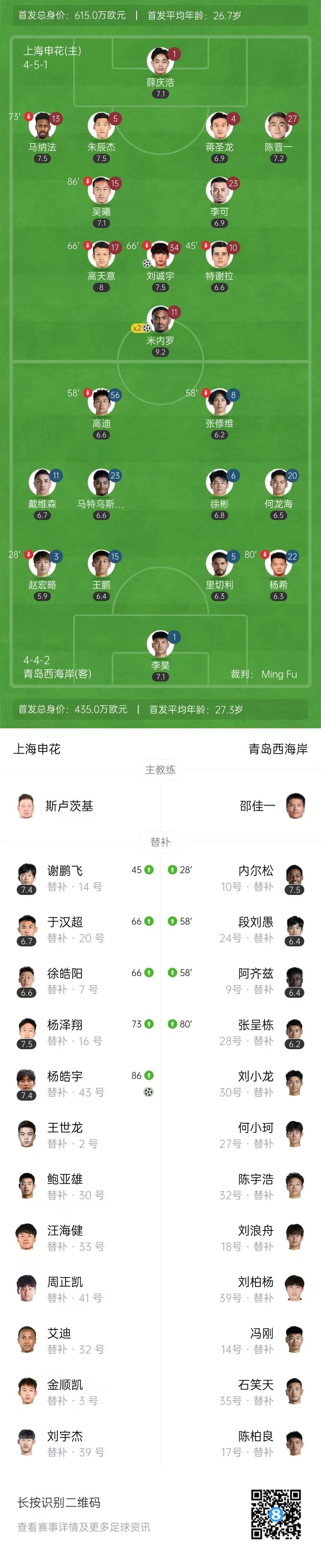 第31分钟,高天意右路同样位置再送传中,米内罗后点头球吊射完成双响,上海申花3-0青岛西海岸。↓