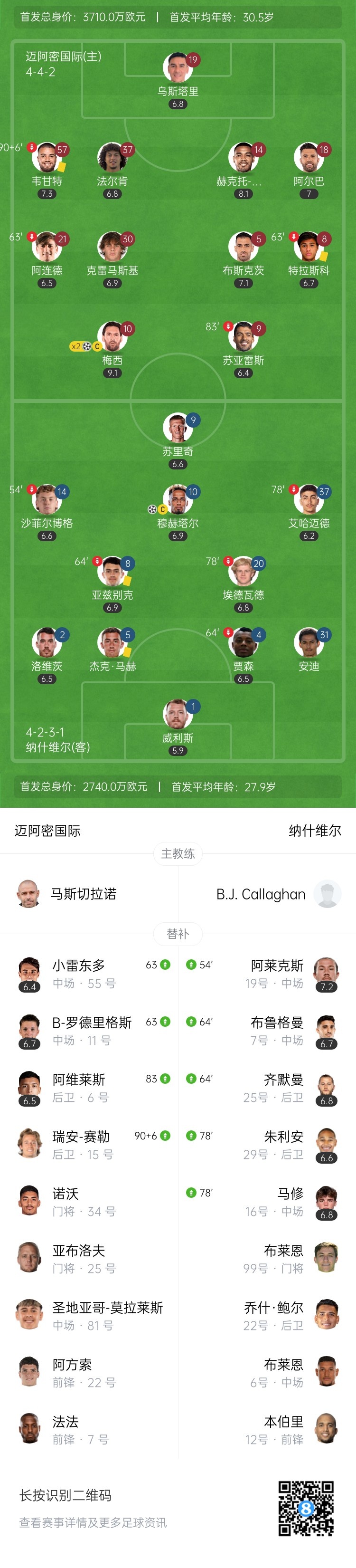 第62分钟,纳什维尔门将威利斯胸部停球,随后传球送大礼,梅西断球过掉门将破门!连续5轮美职联梅开二度!近6轮11球4助!迈阿密国际2-1再次领先纳什维尔↓
