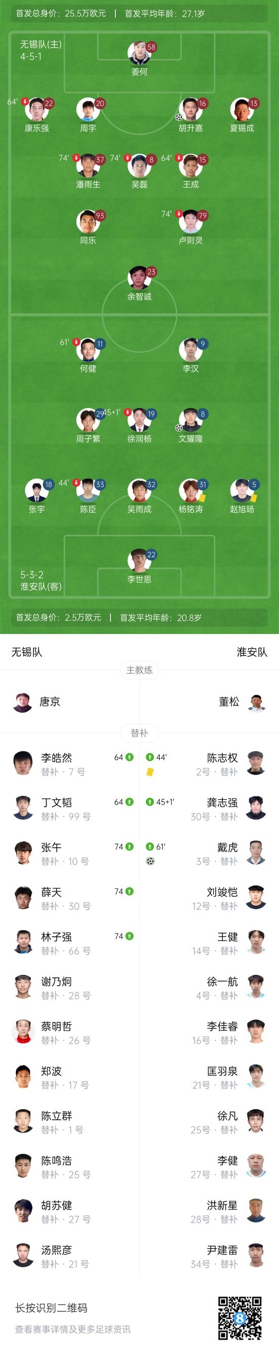 下半场补时8分钟,无锡1-2淮安。