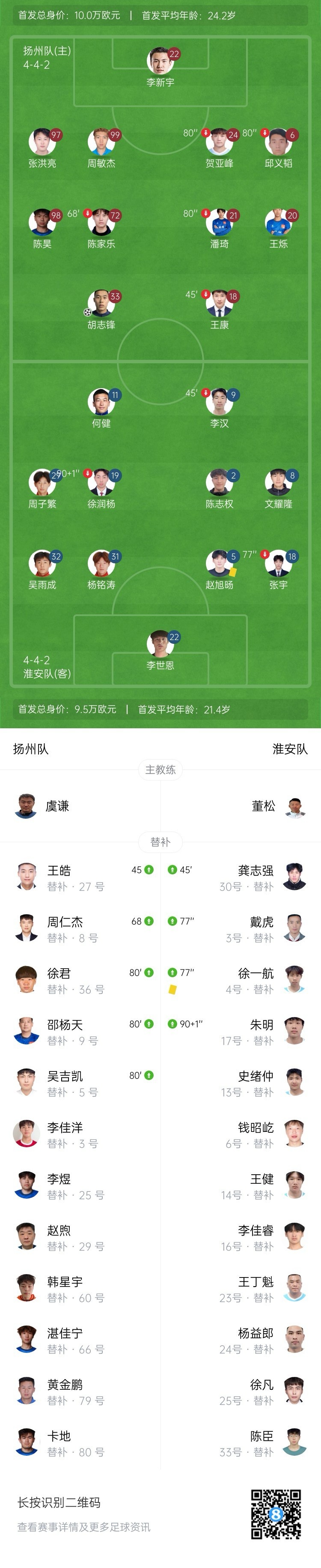 扬州领先!第70分钟,扬州长传到禁区内,胡志锋冷静扣球晃过防守后劲射破门,扬州1-0淮安!↓