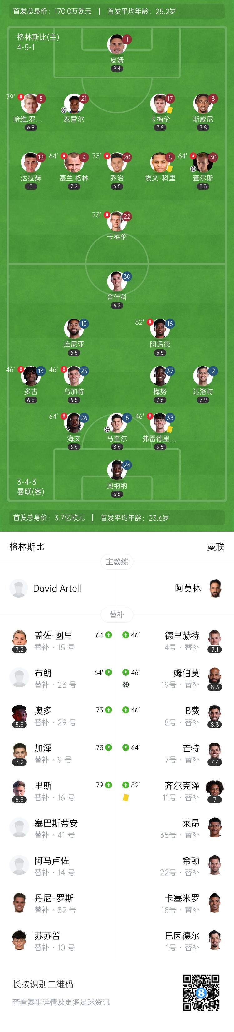 第30分钟,格林斯比左侧角球机会,传中到禁区中,奥纳纳出击失误,沃伦将球打进空门!曼联0-2落后格林斯比↓