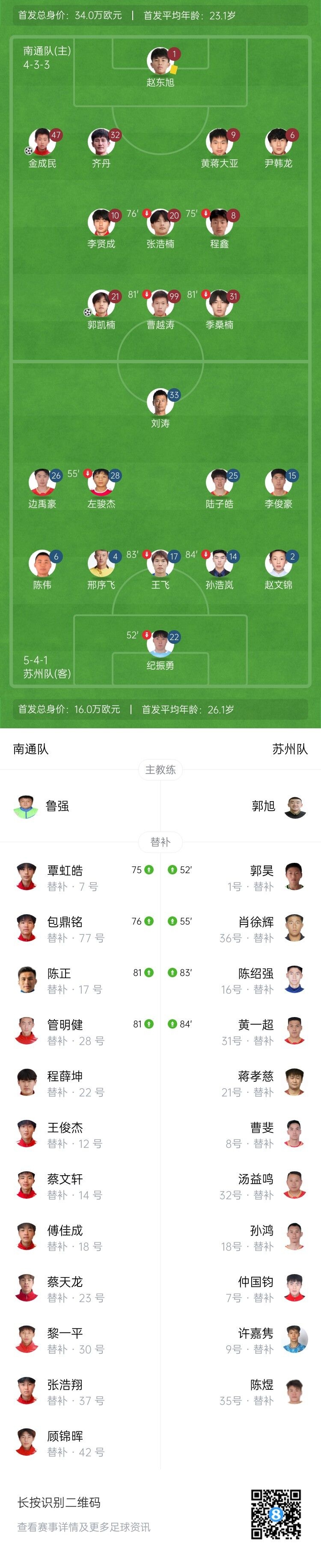 伤停补时6分钟。全场比赛结束,南通队2-1苏州队。