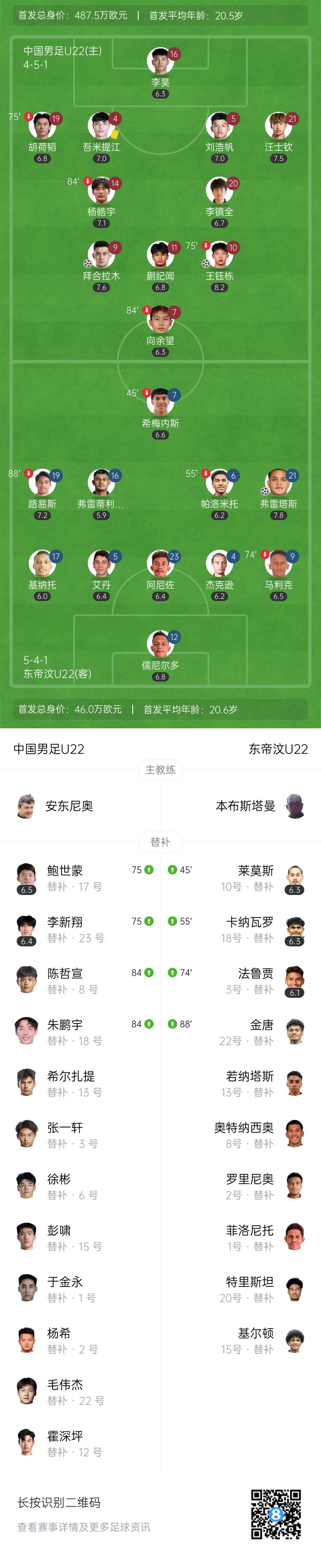第42分钟,中国队前场右路任意球,皮球前点被对手蹭了一下,后点拜合拉木破门!U22国足1-0领先东帝汶↓