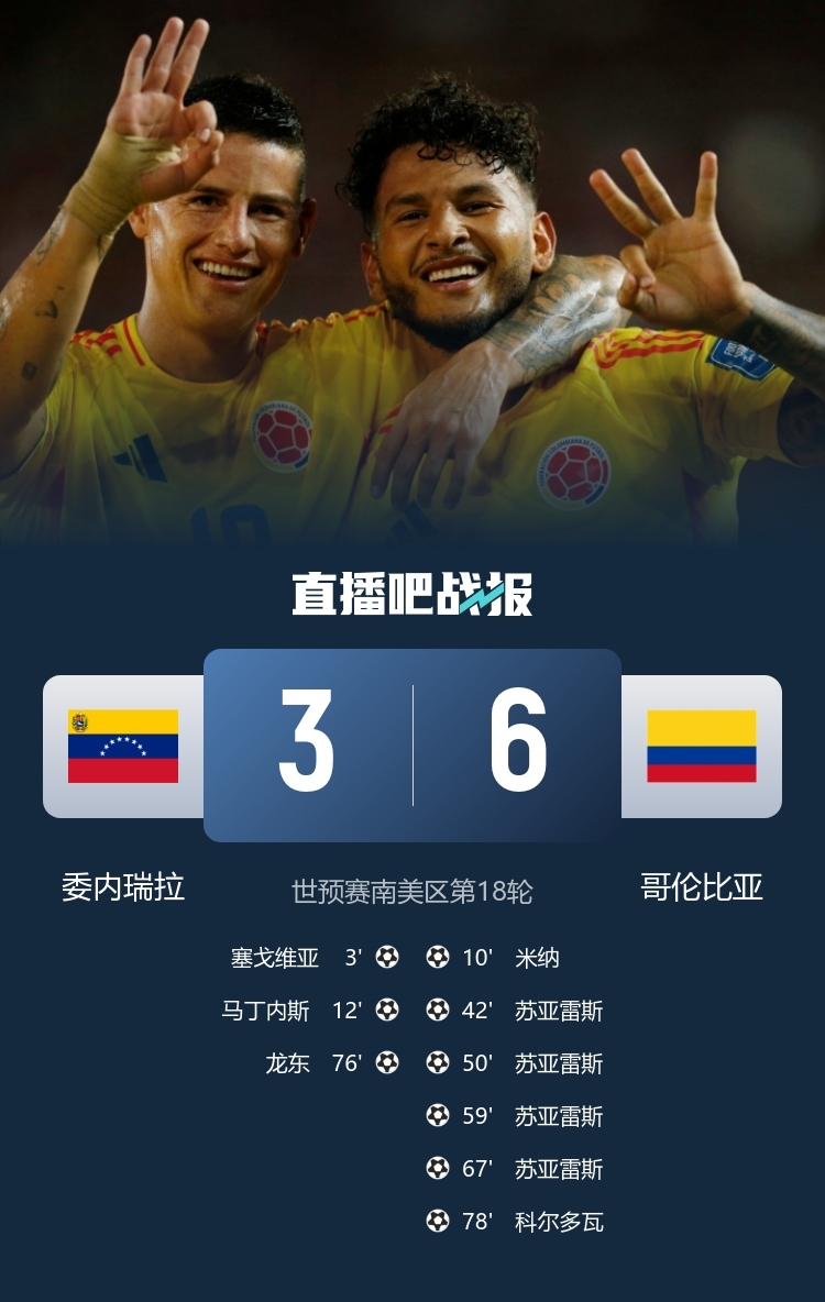 无缘附加赛!委内瑞拉3-6哥伦比亚 苏亚雷斯大四喜J罗两助攻