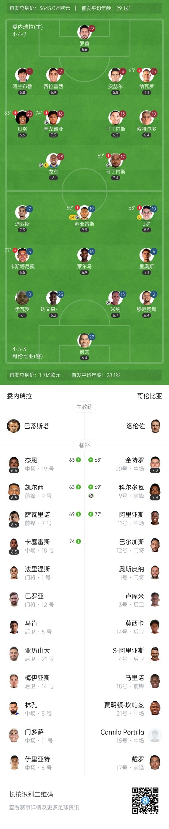 下半场易边再战,第67分钟,J罗和苏亚雷斯同时被换下。↓
