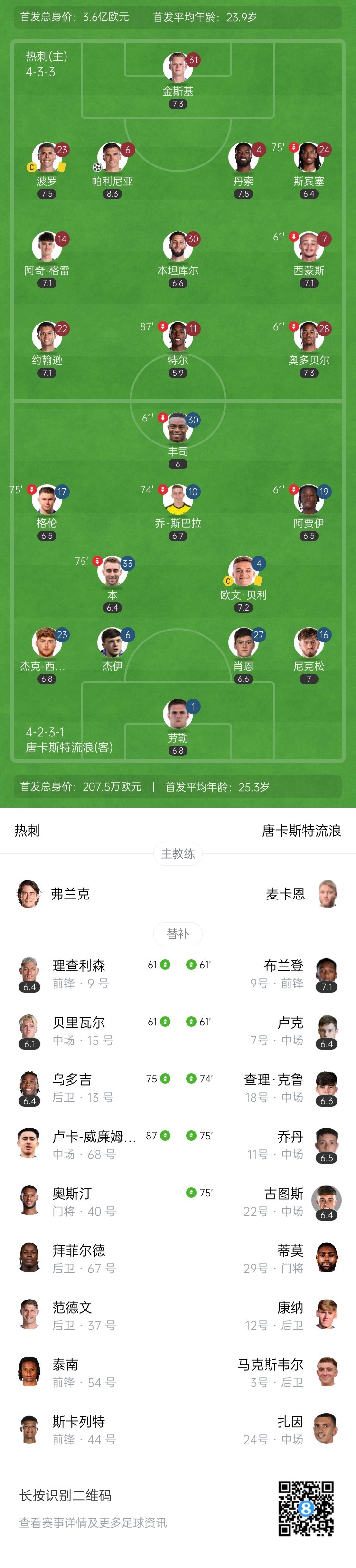 第14分钟,热刺左侧角球机会,哈维-西蒙斯主罚旋向门前!门将将球击出但未能及时回位!帕利尼亚倒钩打进空门!热刺1-0领先唐卡斯特↓
