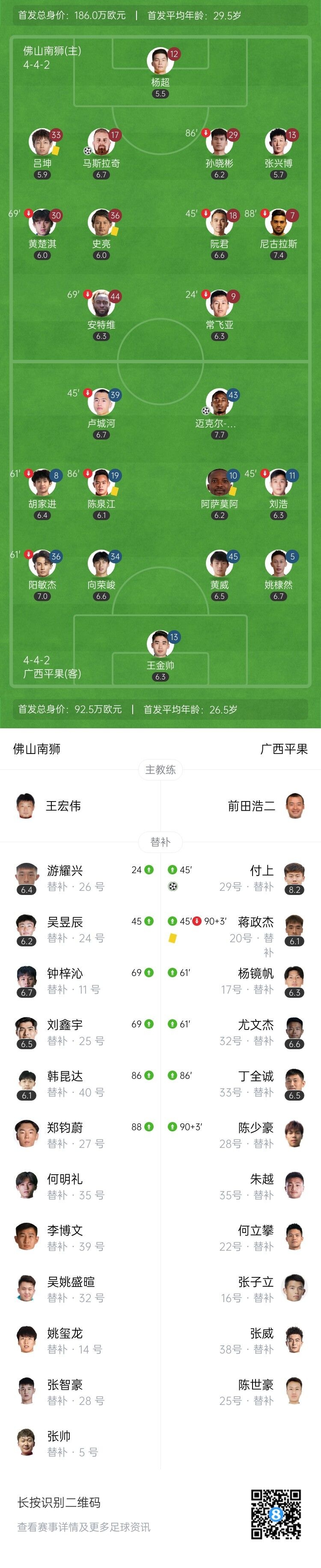 伤停补时9分钟。全场比赛结束,佛山南狮1-2广西平果。