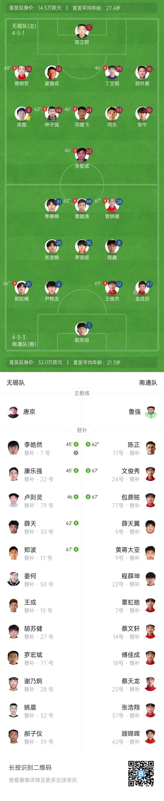 江苏联-无锡1-1南通双双晋级淘汰赛 金成民头球闪击李皓然扳平