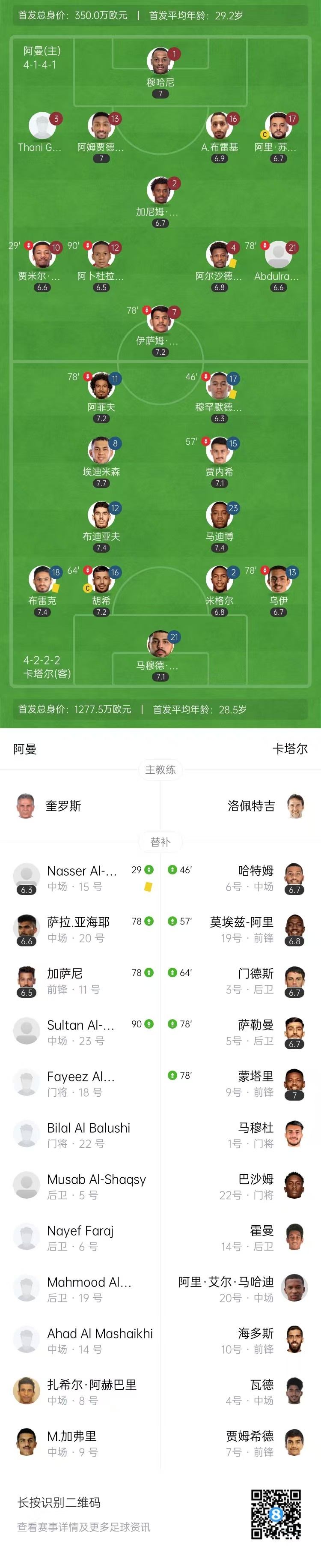 10月9日讯 北京时间10月8日23点,世预赛亚洲区第四阶段A组第一轮,阿曼迎战卡塔尔。上半场,亚哈马迪伤退。下半场,两队都有机会,但都未能把握住。最终阿曼0-0和卡塔尔互交白卷。