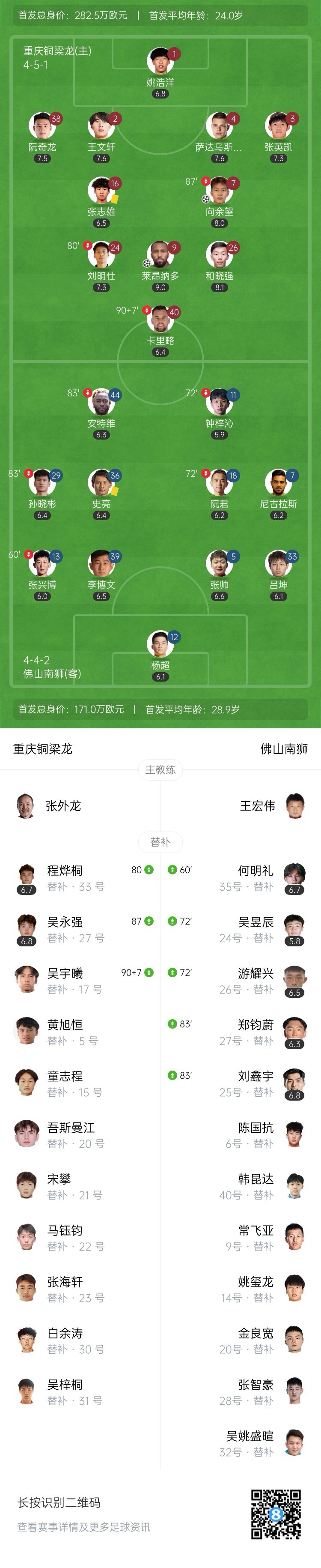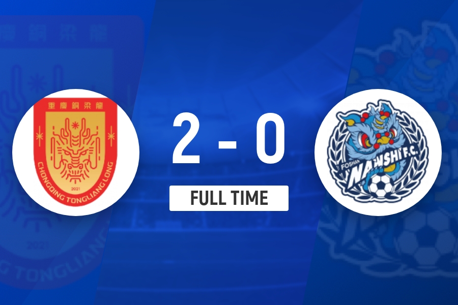 全场比赛结束,重庆铜梁龙2-0战胜佛山南狮。