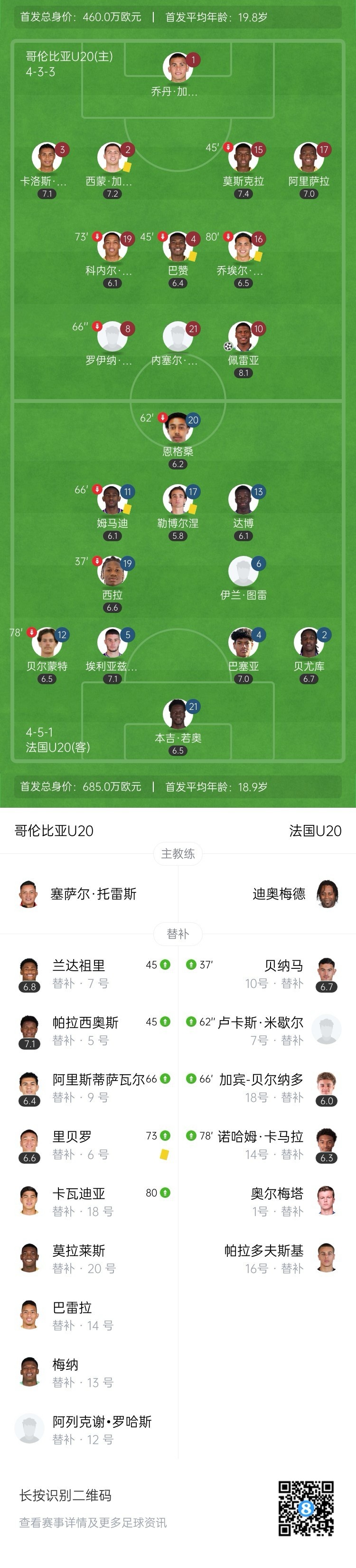 全场比赛结束,U20哥伦比亚1-0战胜U20法国。