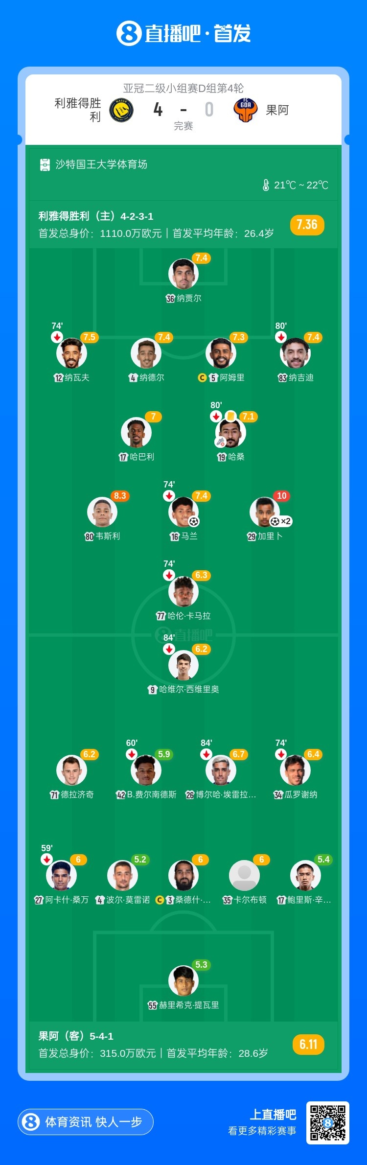 下半场补时5分钟。最终全场比赛结束,利雅得胜利4-0果阿。