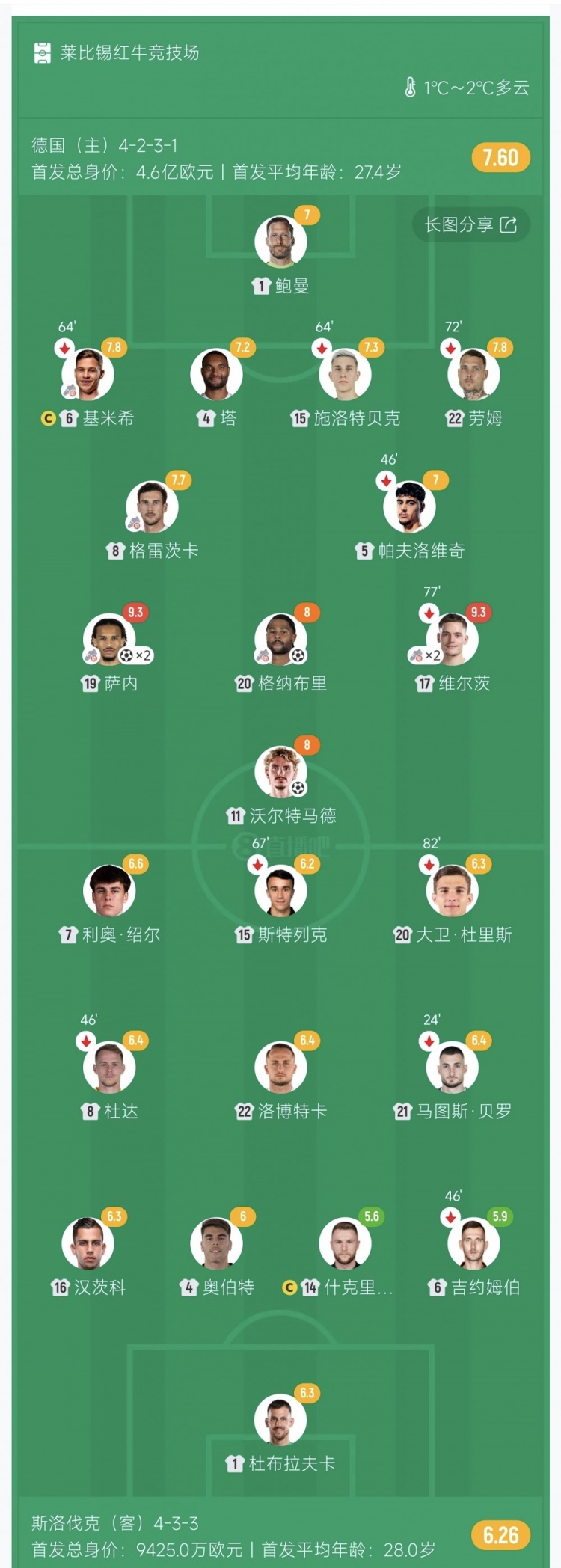 第41分钟,沃尔特马德左路逼抢夺下球权,又是维尔茨禁区线附近送出小挑传,后点萨内包抄垫射破门!德国4-0领先斯洛伐克↓