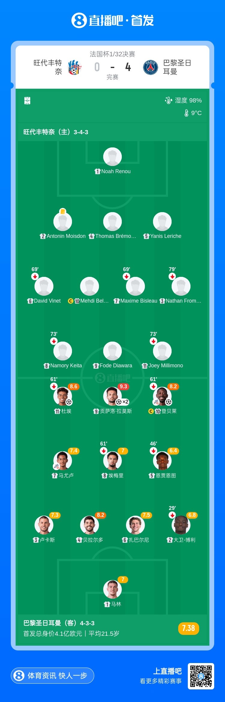 法国杯-巴黎4-0旺代丰特奈晋级32强 登贝莱传射G拉莫斯双响+造点