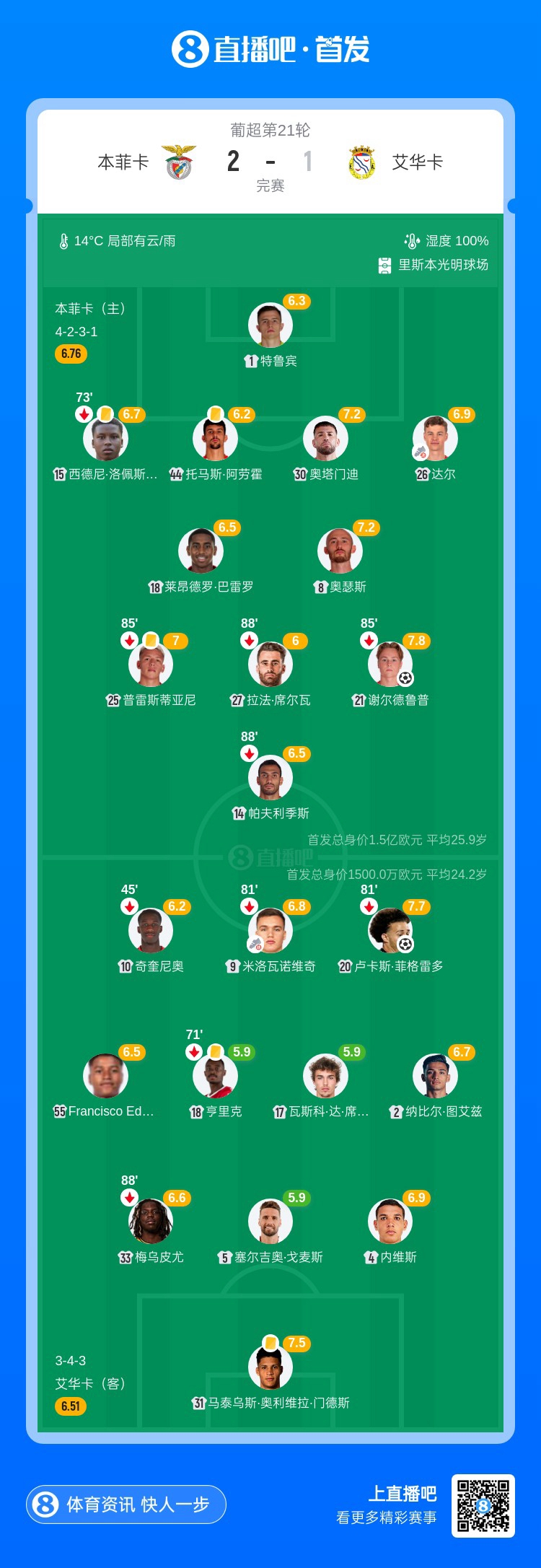 先赛距榜首6分!本菲卡2-1艾华卡 谢尔德鲁普破门克劳迪奥建功