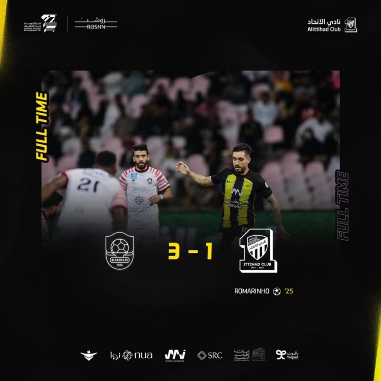第25分钟,伊戈尔后场长传精确制导,罗马里尼奥完美停球,凌空抽射扳平比分!吉达联合1-1布赖代先锋↓