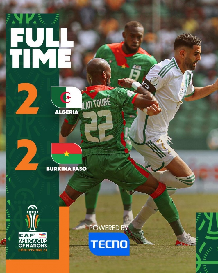 1月20日讯北京时间1月20日22时,非洲杯小组赛D组,阿尔及利亚对阵布基纳法索。上半场,默罕默德-科纳在补时阶段鱼跃冲顶破门打破场上僵局;半场战罢,阿尔及利亚暂0-1布基纳法索;下半场,布尼贾赫补射破门扳平比分,努里送点,特拉奥雷点射破门再次为布基纳法索取得领先,补时阶段布尼贾赫再入一球再次扳平比分。全场比赛结束,阿尔及利亚2-2布基纳法索,阿尔及利亚两连平暂居小组第二!