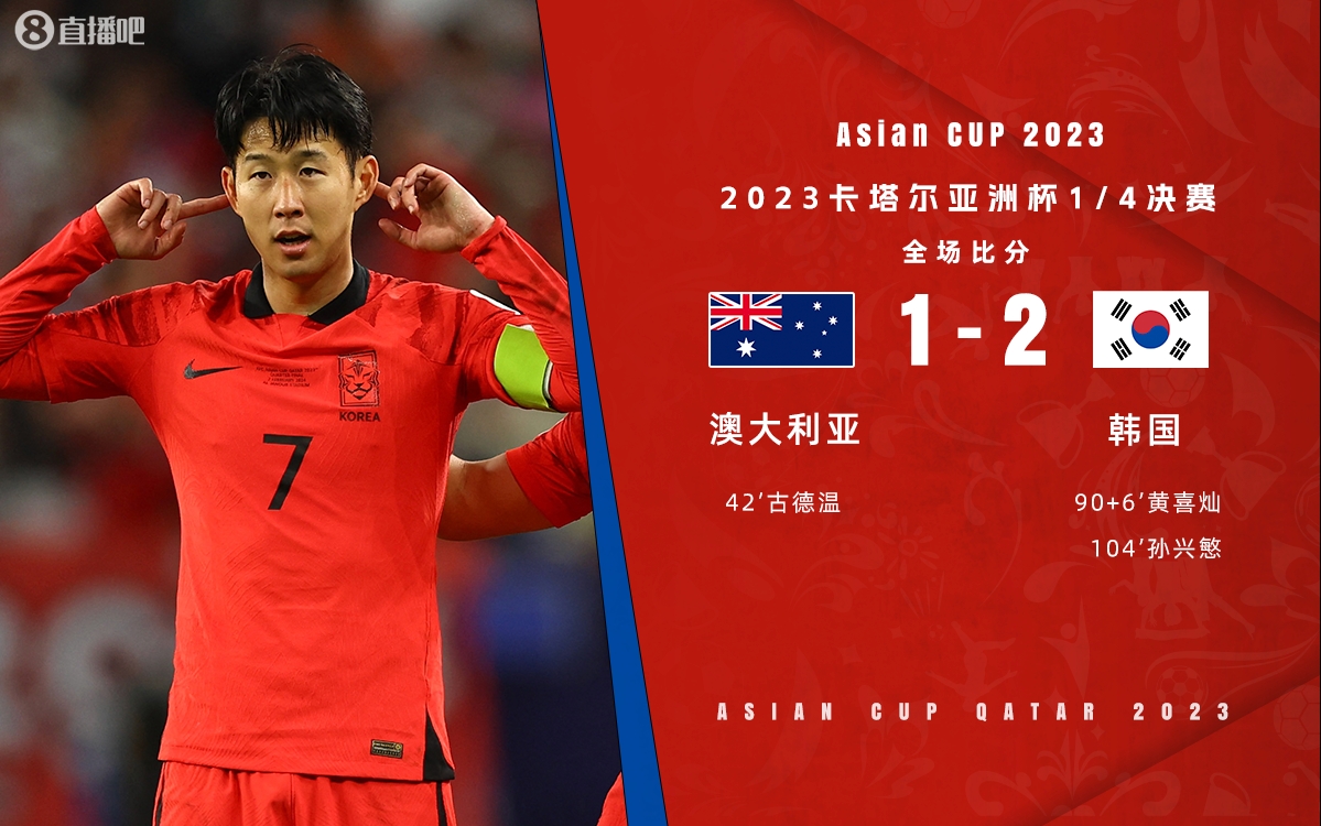 2月3日讯 北京时间今天23:30,亚洲杯1/4决赛焦点对决,澳大利亚对阵韩国。上半场末段,古德温凌空斩破门;下半场补时阶段,孙兴慜造点,黄喜灿主罚命中,双方进入加时,加时赛孙兴慜任意球直接破门,最终韩国2-1逆转澳大利亚,半决赛将战约旦。