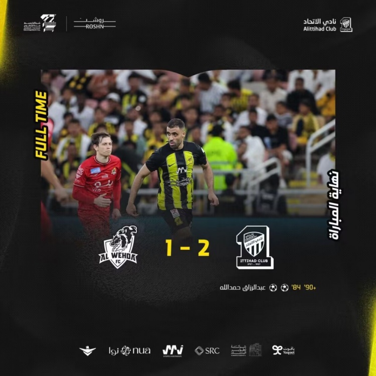 全场比赛结束,吉达联合2-1麦加统一。