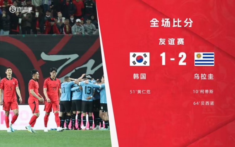 全场比赛结束,韩国1-2不敌乌拉圭。