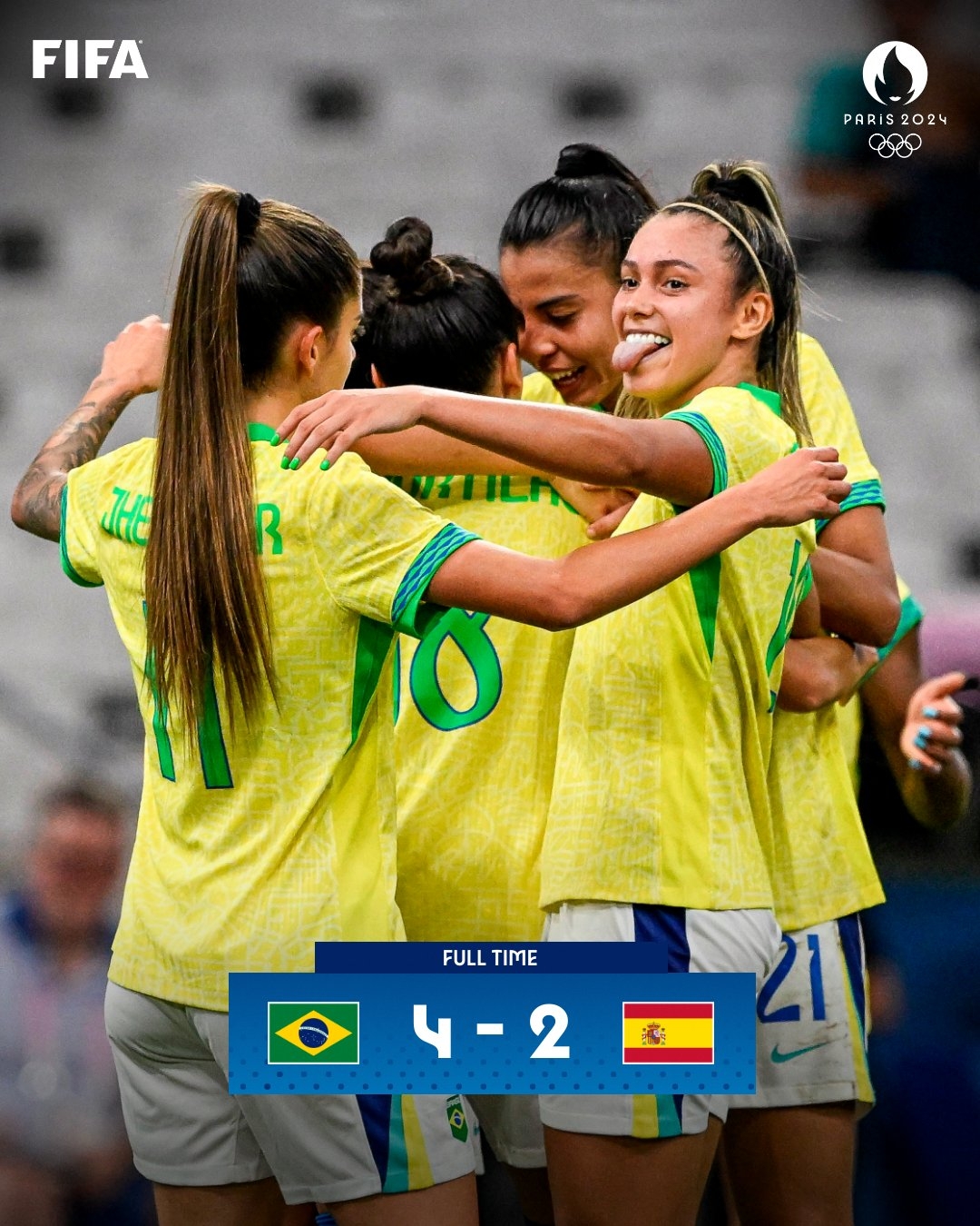 比赛补时最后阶段,萨尔玛-帕拉卢埃再扳一球,巴西4-2西班牙。