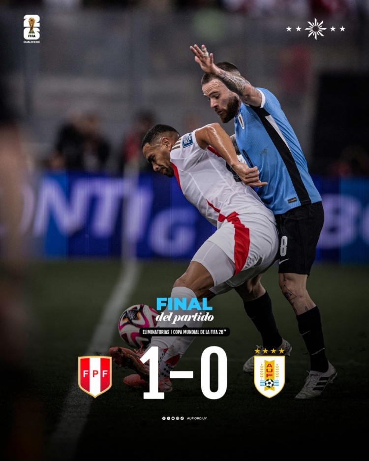 10月12日讯 北京时间10月12日上午9:30,世预赛南美区第9轮,乌拉圭客场挑战秘鲁。上半场,双方半场合计仅1脚射正。下半场,米格尔-阿劳霍88分钟头球绝杀。全场结束,乌拉圭0-1秘鲁。本场过后,乌拉圭积15分排名第三,落后榜首的阿根廷4分;秘鲁积6分排名第9。
