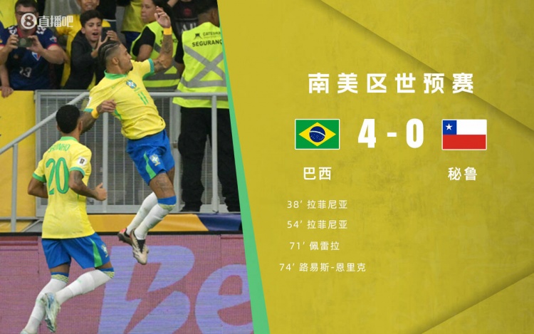 巴西4-0秘鲁两连胜升至南美区第4 佩雷拉凌空斩拉菲尼亚双响