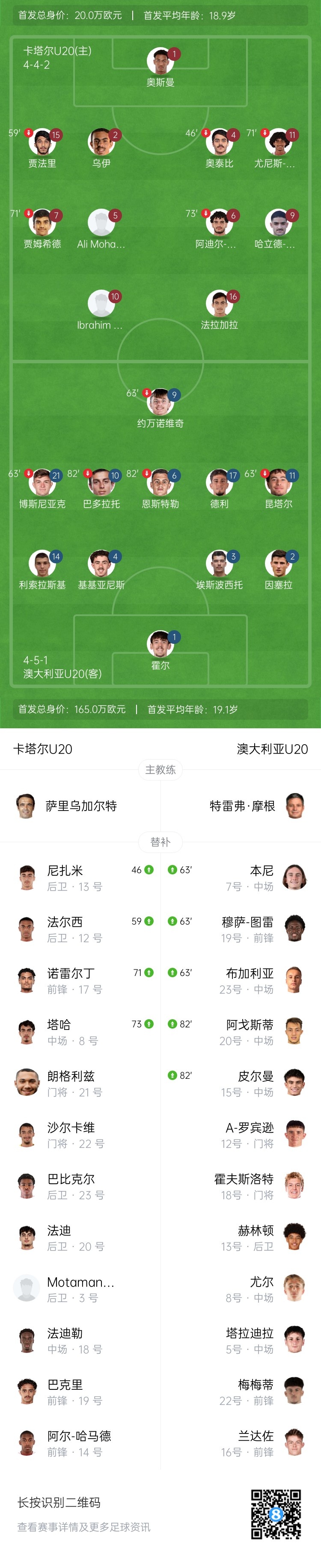 第69分钟,澳大利亚U20中路策动攻势,本尼接到队友斜传,得球突入禁区,右脚爆射近角得手,澳大利亚U203-1卡塔尔U20。↓