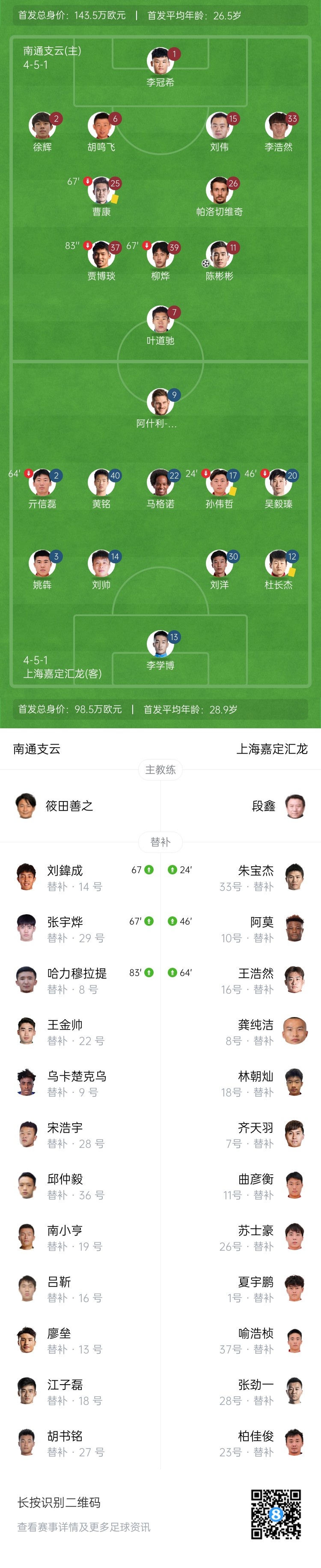 3月15日讯 北京时间3月15日晚上19:30,中甲第1轮,南通支云坐镇如皋奥体中心体育场迎战上海嘉定汇龙。上半场,贾博琰越位进球。下半场,陈彬彬补射破门。全场结束,南通支云1-0上海嘉定汇龙,取得开门红。