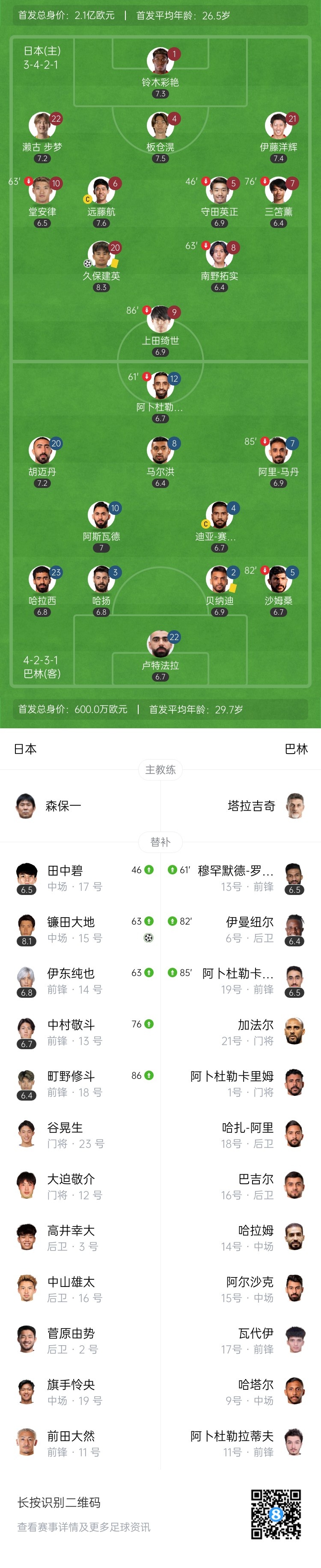 第65分钟,久保建英中场送出直塞,镰田大地面对门将冷静将球打进,日本1-0巴林。↓