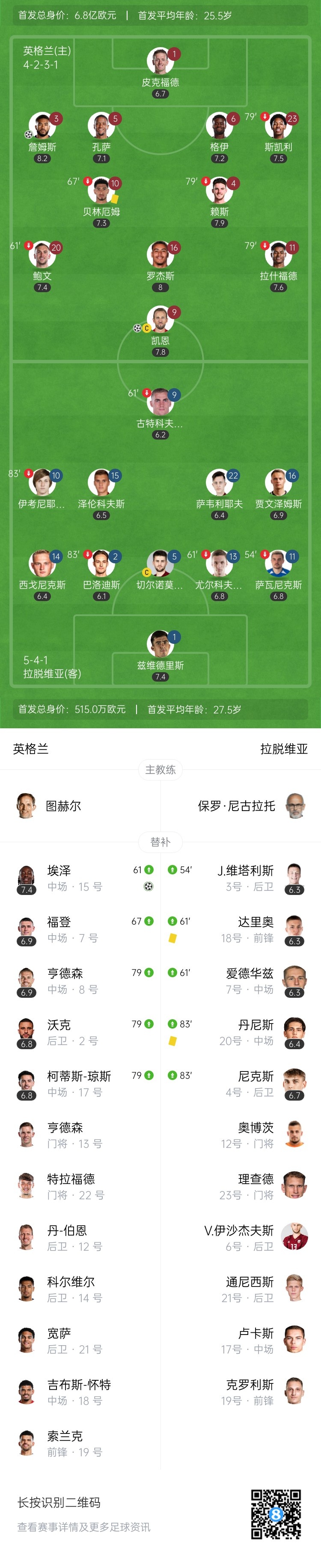 第22分钟,英格兰的角球,贝林厄姆禁区中的头球攻门!顶在拉什福德身上被挡出↓