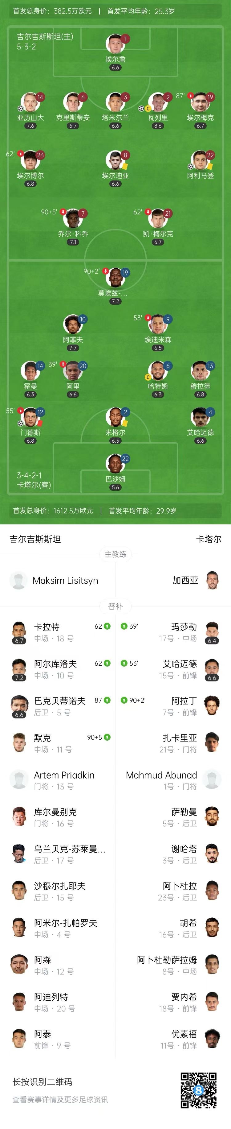 第94分钟,阿尔库洛夫禁区内分球,阿利马登得球低射破门,吉尔吉斯斯坦锁定胜局,3-1!↓