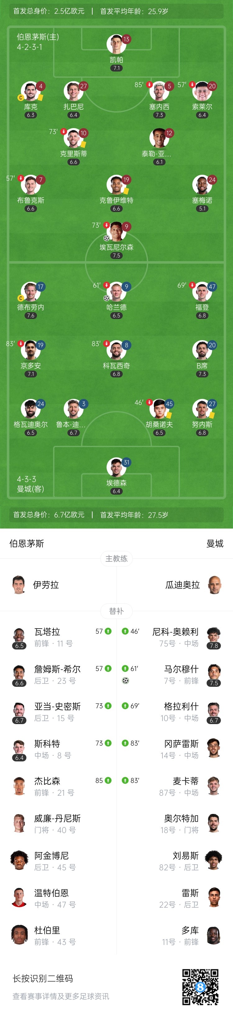 全场比赛结束,最终曼城2-1逆转伯恩茅斯。