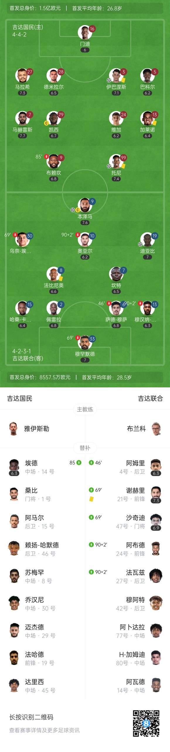 上半场补时5分钟,吉达国民0-0吉达联合。