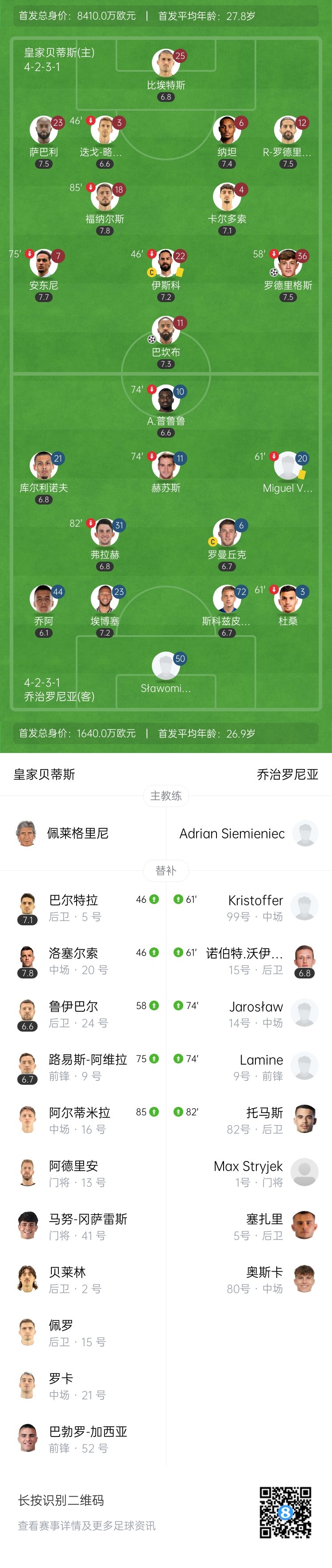 4月11日讯 北京时间3:00,欧协联1/4决赛首回合皇家贝蒂斯vs乔治罗尼亚,比赛在比利亚马林球场打响!上半场,安东尼多次造险!巴坎布单刀破门,半场补时赫苏斯-罗德里格斯破门!下半场,赫苏斯-罗德里格斯中柱。最终,贝蒂斯2-0击败乔治罗尼亚,在两回合比赛中占得先机!