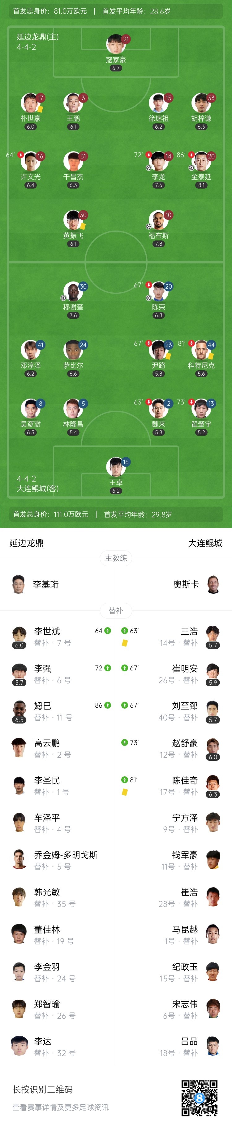 第69分钟,延边右路送出传中,李龙后点无人盯防情况下头球扳平比分,延边龙鼎2-2大连鲲城。↓
